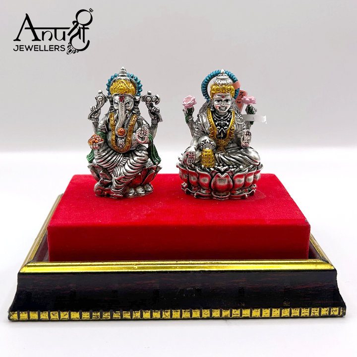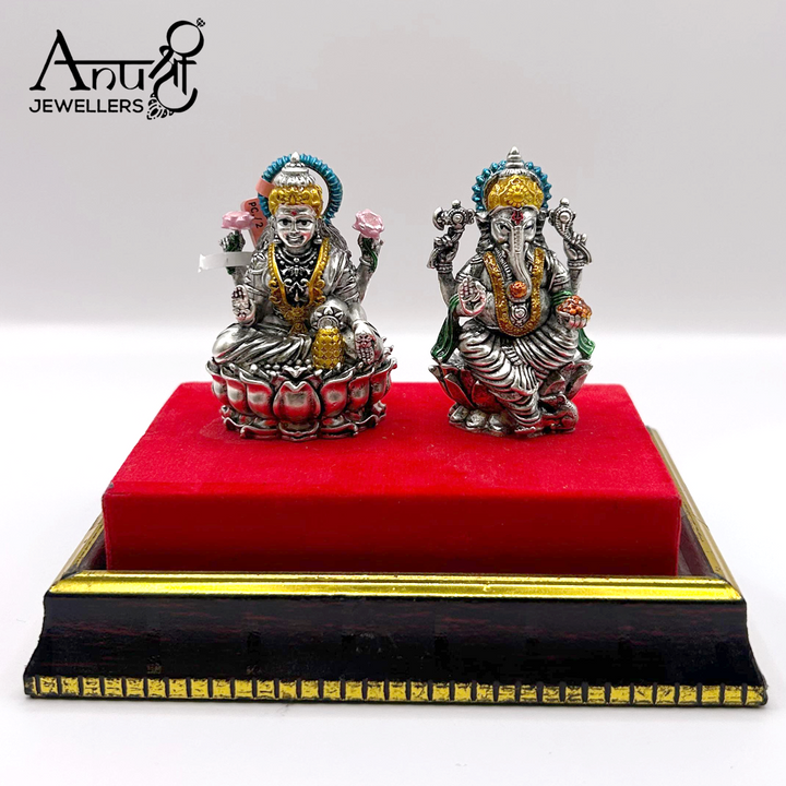 This pure silver murti set features finely crafted idols of Lakshmi and Ganesha, symbolizing prosperity, wisdom, and blessings. Designed in authentic 925 sterling silver with artistic colored highlights, the set brings divine elegance to your home temple or office space. Ideal for Diwali puja, festive rituals, and gifting, these idols are a perfect blend of tradition and craftsmanship.
