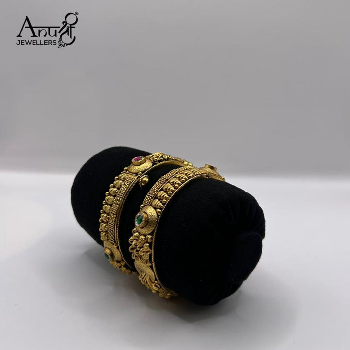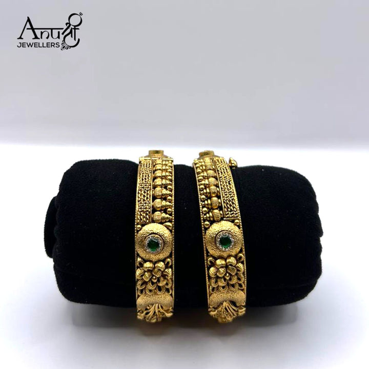 This exquisite pair of gold-plated bangles showcases intricate traditional craftsmanship with detailed filigree work, floral motifs, and green gemstone accents. The ornate design features textured patterns, beaded borders, and decorative elements throughout, creating statement pieces perfect for weddings, festivals, or special cultural celebrations.