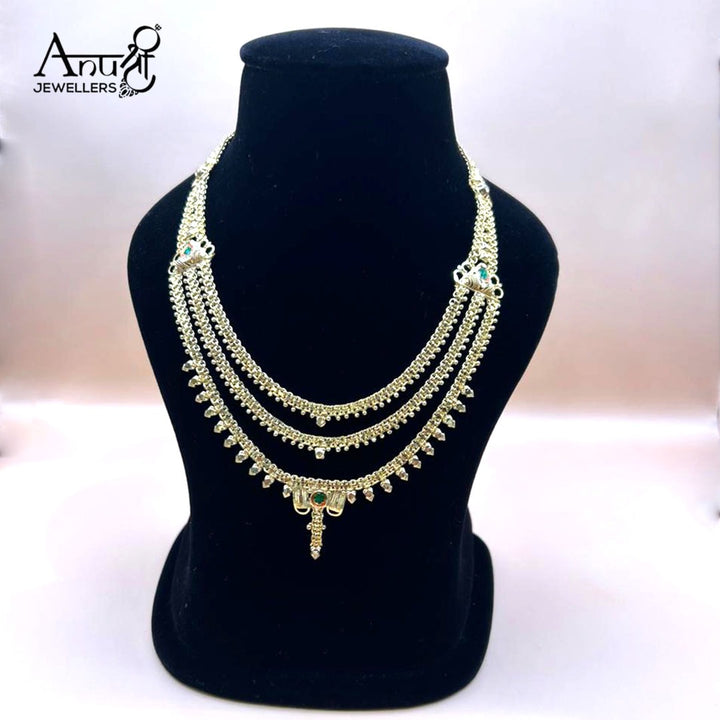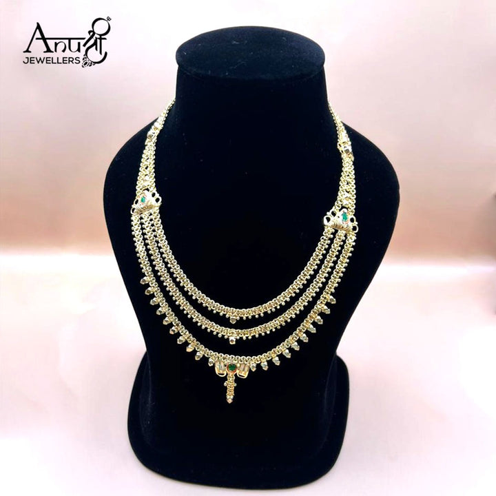 Exquisite three-layered gold-toned necklace with a traditional design. Features intricate droplet motifs on each chain and is highlighted by green stone accents at the shoulders and a central drop. Perfect for festive and wedding occasions.