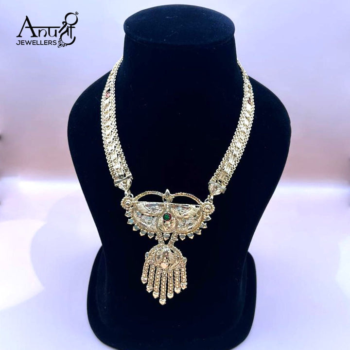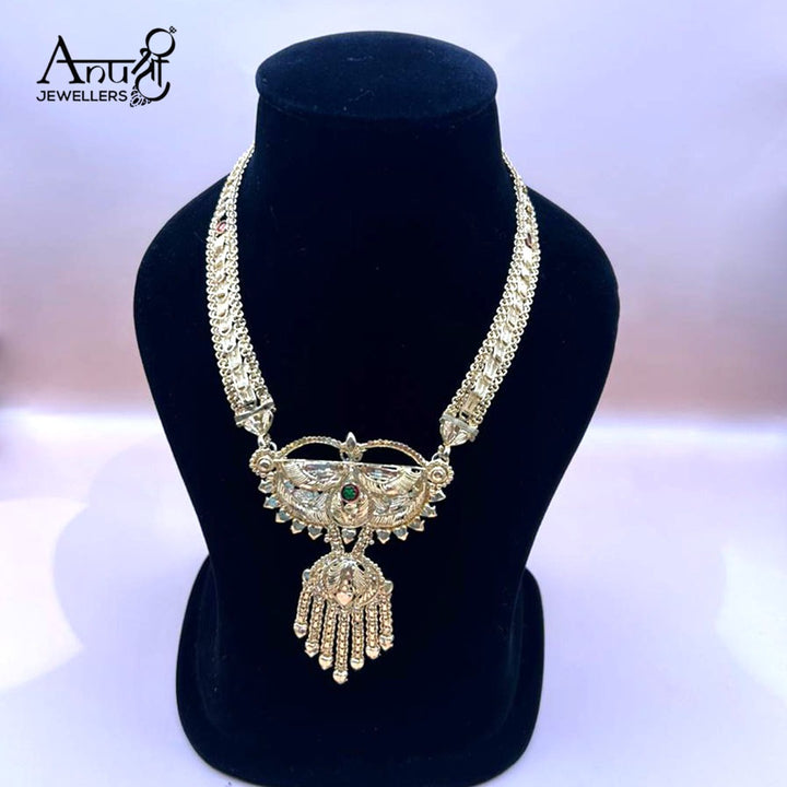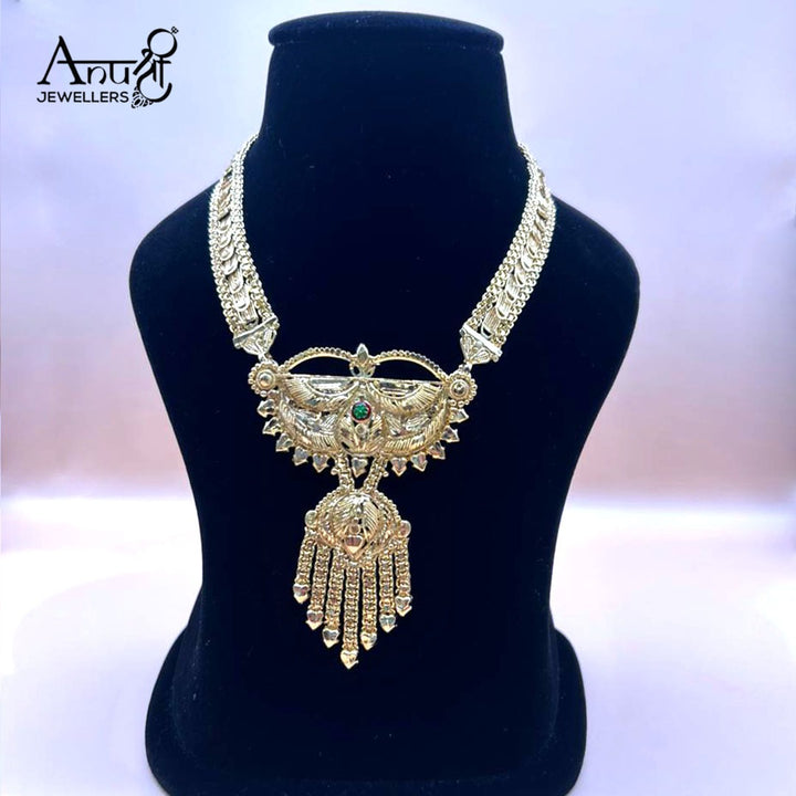 This striking gold-toned necklace features a bold, intricately carved central pendant with a green stone accent. The heavy, textured side chains lead to an elaborate drop section with multiple shimmering tassels, making it a luxurious, traditional statement piece.