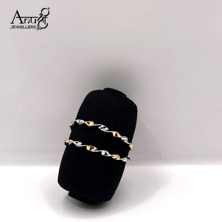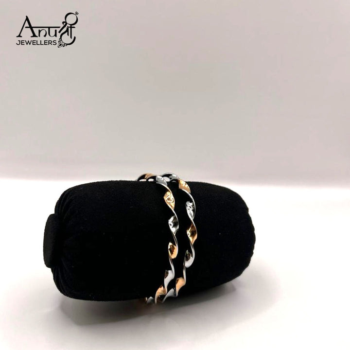 This stylish pair features an elegant twisted design combining silver and rose gold-toned finishes. The intertwined pattern creates visual depth and movement while the contrasting metals add contemporary appeal. The sleek, modern design makes these bangles perfect for everyday wear or as sophisticated accent pieces.