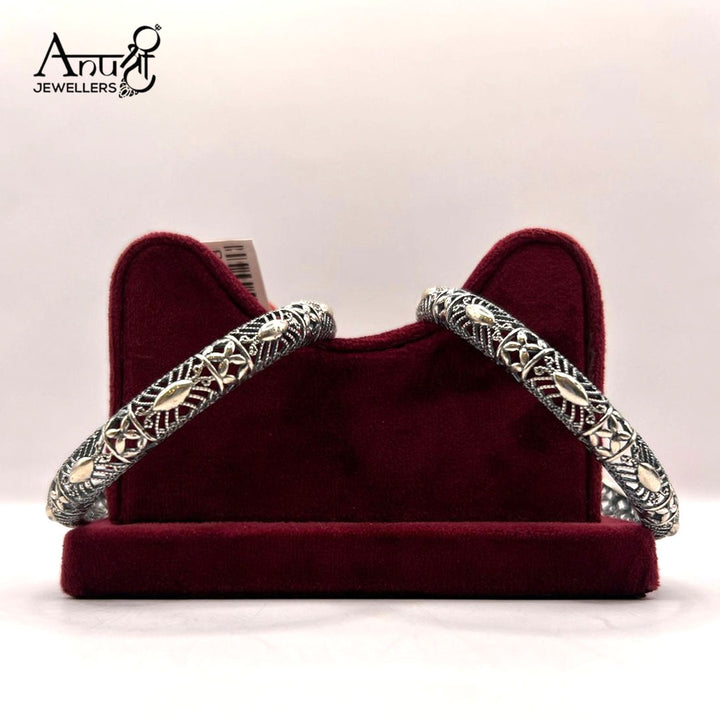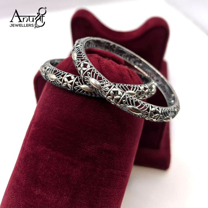 Experience the magic of artisan jewelry with this gorgeous pair of oxidized silver bangles. Each piece is a testament to meticulous craftsmanship, featuring a beautiful openwork (jali) design that catches the light and reveals intricate floral and leaf motifs. The rich, darkened silver finish provides an antique, heirloom feel that pairs effortlessly with traditional Indian attire or serves as a unique accent for modern fashion. They are lightweight, comfortable, and designed to be cherished.