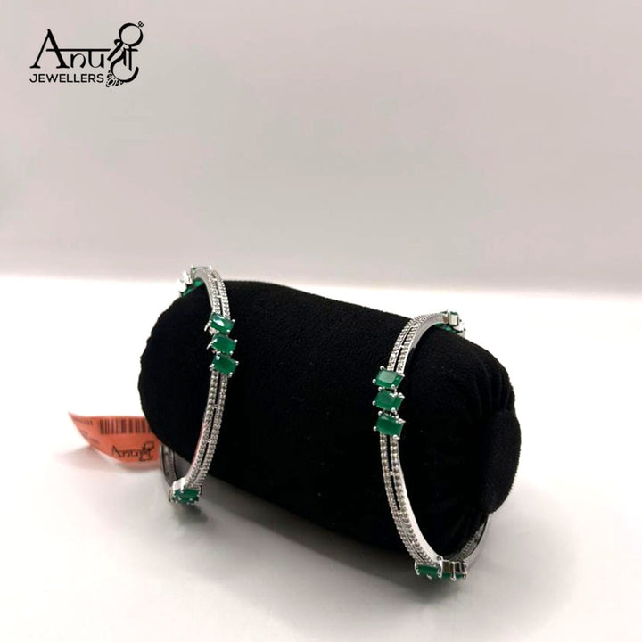 Step into the spotlight with this stunning pair of contemporary bangles. Designed for the modern woman, they feature vibrant, emerald-cut green stones set horizontally, alternating with dazzling bands of micro-pave cubic zirconia (or diamonds, depending on the actual stone). The sleek, silver-toned plating enhances the brilliance of the stones, creating a luxurious and high-fashion look. Perfect for cocktail parties, evening events, or adding a rich pop of color to your festive wear. These bangles are true statement pieces that blend classic elegance with a bold, contemporary design.