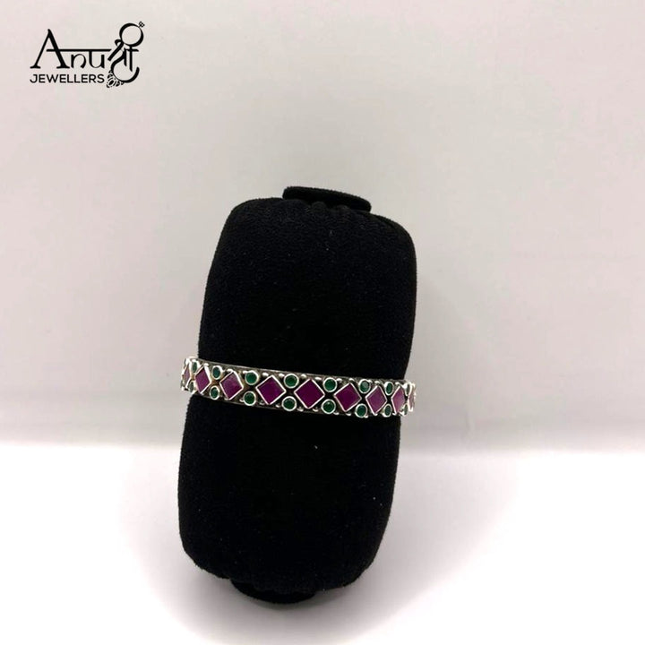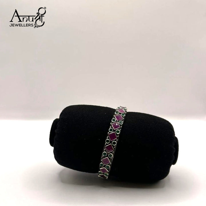 Embrace the opulent colors of traditional Indian jewelry with this striking bangle. The piece features a continuous geometric pattern of brilliant ruby-red and contrasting deep emerald-green stones, all set in a rich, oxidized silver-toned base.The combination of the deep, rich colors and the darkened metal finish gives the bangle an authentic antique or vintage look, reminiscent of traditional temple jewelry. Perfect for pairing with saris, lehengas, or adding a touch of bold, ethnic color to any ensemble.