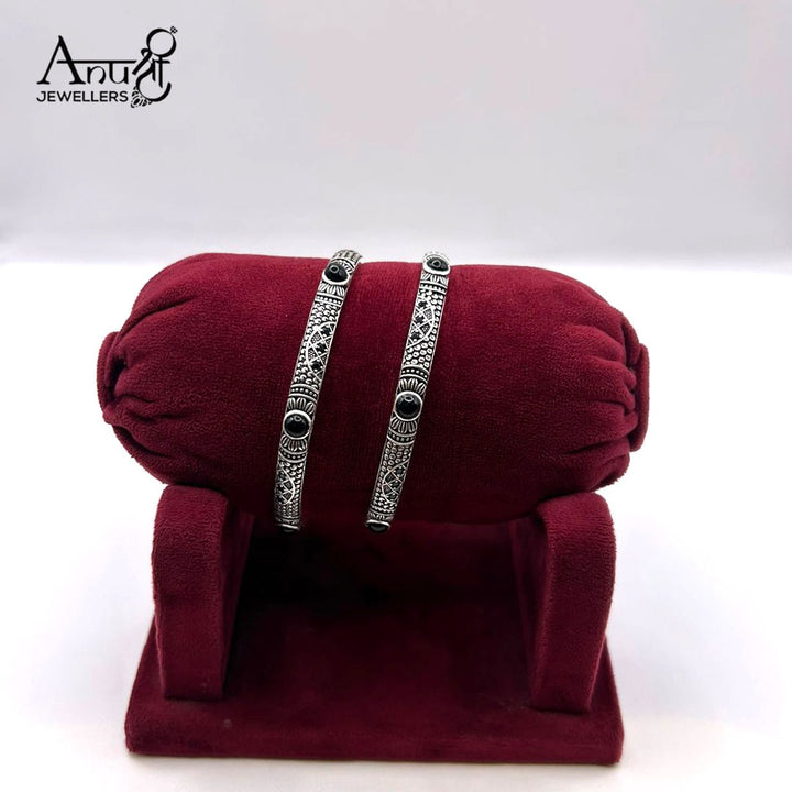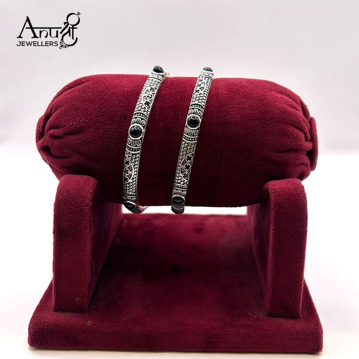Capture the spirit of vintage jewelry with this striking pair of oxidized silver-toned bangles. The design features a continuous, highly-textured band with intricate beadwork and deep engraving, giving the piece a rich, antique character. The heavy texture is beautifully contrasted by smooth, polished black onyx-look cabochon stones set periodically along the circumference. This juxtaposition of matte engraving and glossy accents creates a visually appealing piece that is perfect for traditional occasions or for adding an ethnic-boho edge to a contemporary look.