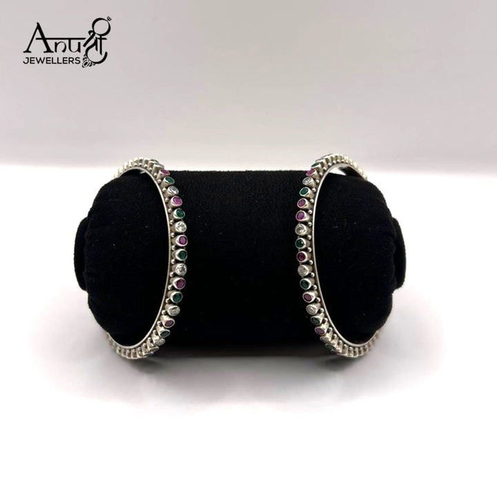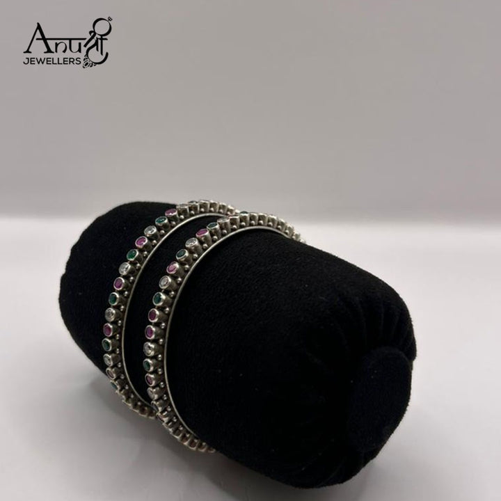 Perfect for building your everyday stack or adding a subtle flash of color to your attire. This pair of bangles features a classic oxidized silver-toned finish set with a timeless array of ruby-red, emerald-green, and crystal-white (or diamond-look) round stones. The continuous, simple design makes them incredibly versatile—wear them with traditional outfits for a coordinated look or mix and match them with modern bracelets for a chic, eclectic style. Their delicate size ensures comfortable, all-day wear while the oxidized finish adds an antique, handcrafted appeal.