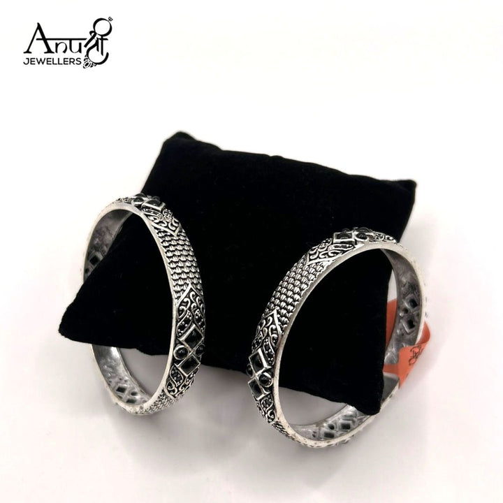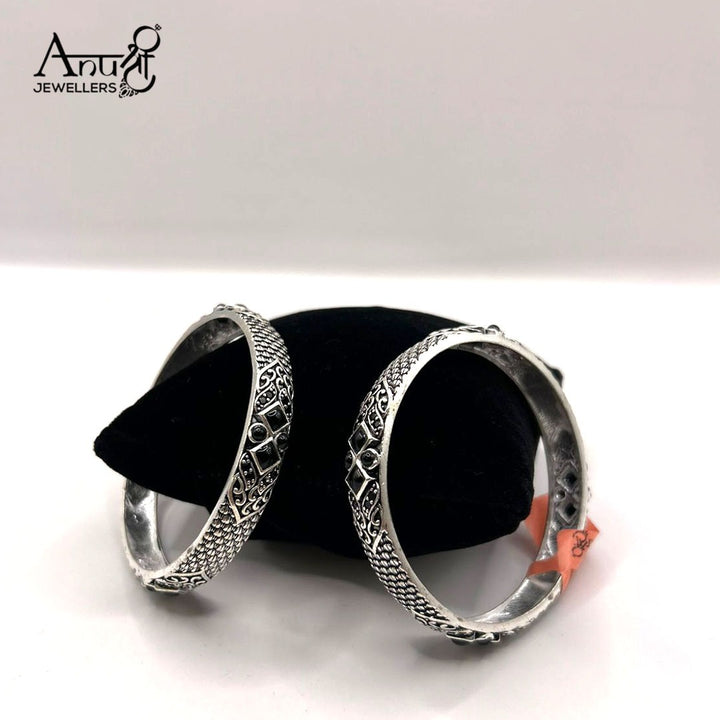 Make a strong statement with this striking pair of bangles that beautifully contrasts texture and polish. The design is split, featuring one side with rich, intricate floral scrolling and the other side with a dense, scaled or woven texture. Small, faceted black stones are strategically set along the circumference, enhancing the deep oxidized silver finish for a dramatic, antique, or even Gothic chic aesthetic. These are the perfect pieces for adding a touch of bold, unconventional style and texture to both ethnic and contemporary outfits.