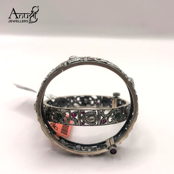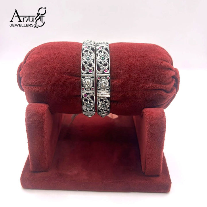 Capture the essence of Indian temple jewelry with this elaborate pair of bangles. Crafted in a rich oxidized silver tone, the design features distinct panels showcasing classic cultural motifs. The repeating pattern highlights bold floral mandalas accented with brilliant ruby-red and emerald-green stones, flanked by traditional peacock or lion head (makara) motifs. These highly detailed bangles embody an heirloom quality and are the perfect accompaniment for heavy silk saris, traditional bridal wear, or any grand festive occasion where cultural artistry is celebrated.