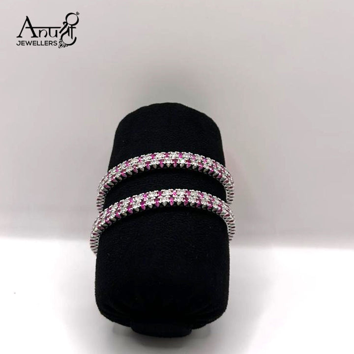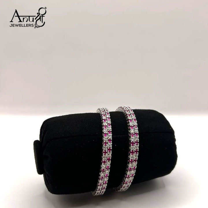 Experience the brilliance of micro-pave setting with these stunning bangles. The meticulous placement of the small stones ensures a completely covered surface that reflects light from every angle. The subtle color contrast between the central pinkish-red row and the outer white rows highlights the fine craftsmanship. The bright silver-toned finish completes the look, offering a piece that feels luxurious and shines beautifully under any light.