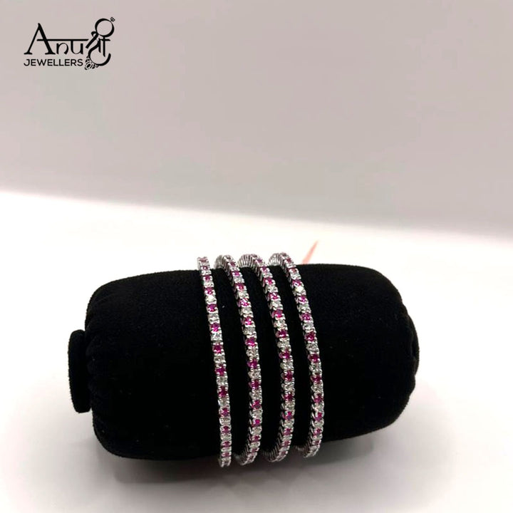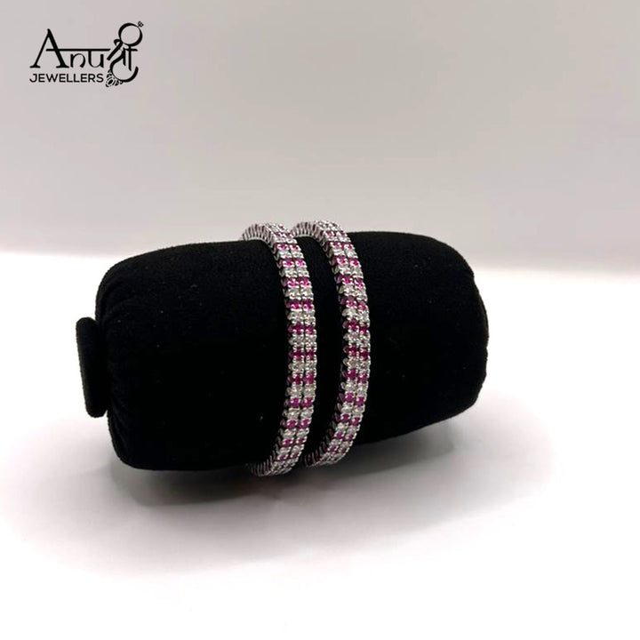 Indulge in the luxurious look of fine jewelry with this striking pair of bangles. Each piece features a dazzling three-row design: a vibrant central band of fuchsia/ruby-red stones flanked by two rows of brilliant white crystal accents (or diamond-look stones). The intricate micro-pave setting ensures that the entire surface shimmers with continuous brilliance, offering a high-carat sparkle. The dramatic contrast between the deep pinkish-red and the icy white stones, set in a gleaming silver-toned finish, makes these bangles a true statement piece for galas, festive events, or any occasion requiring a touch of sophisticated drama.