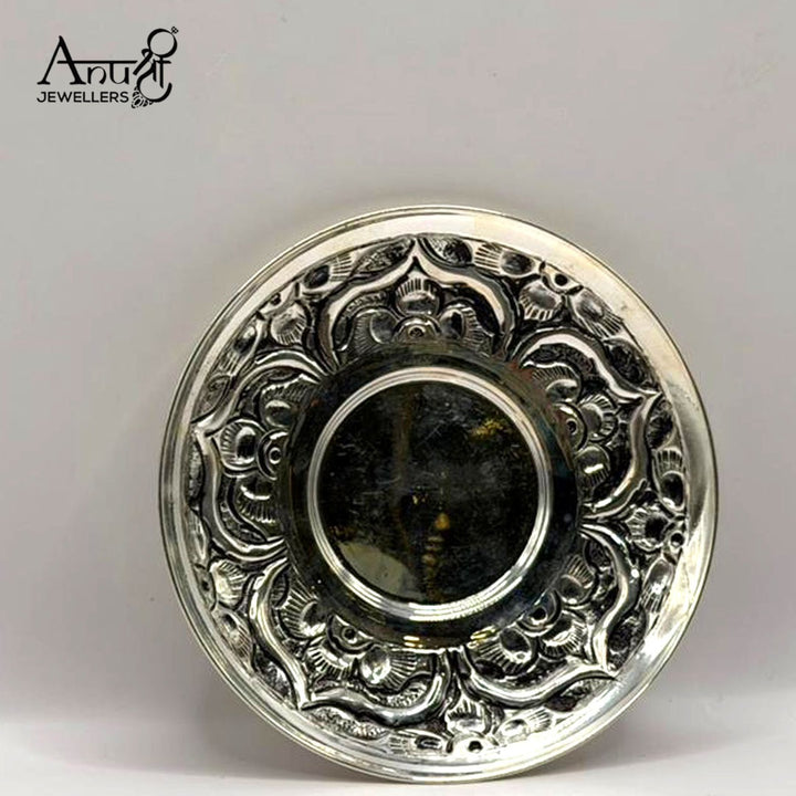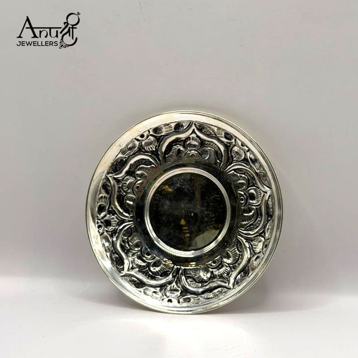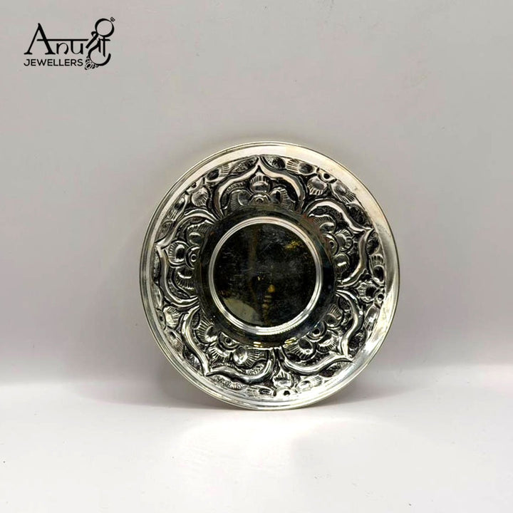 This exquisite silver plate or coaster weighs 47.100 grams and features intricate, deep floral and leaf carvings around the rim. Its smooth, recessed center is ideal for holding a small vessel. Crafted by Anushree Jewellers, this piece is perfect for religious rituals or as sophisticated decorative silverware.