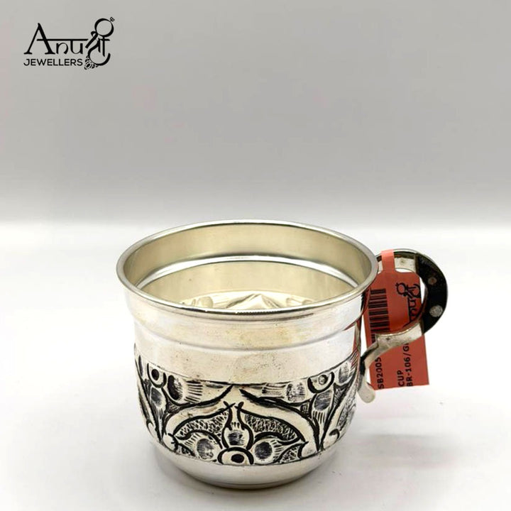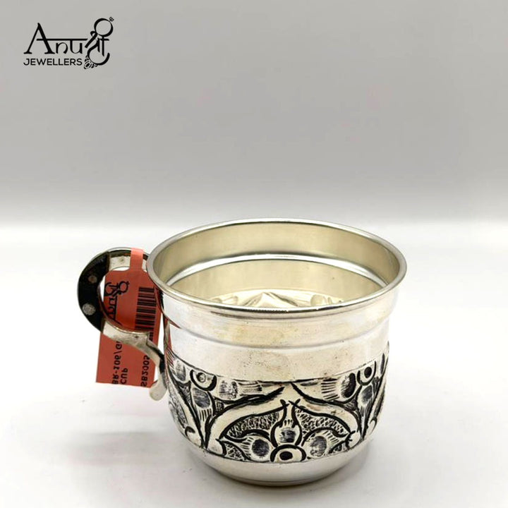 This traditional silver cup, weighing 55.000 grams, features a wide band of oxidized or antique-finish floral and foliage engraving around the base. The contrast of the dark design against the polished silver creates a striking look. Complete with a small, sturdy handle, this piece is ideal for gifting or ritualistic use.
