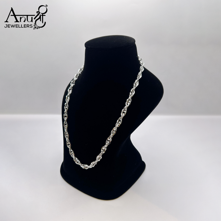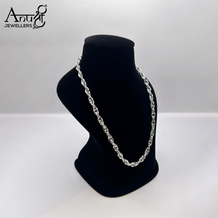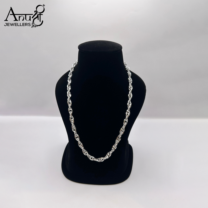 Add a touch of timeless texture to your collection with this distinctive chain. The design features a continuous pattern of twisted links that catch the light beautifully, giving the look of a traditional rope chain with a unique, flattened profile. Finished in a bright, polished silver tone, this chain is substantial enough to be worn on its own as a simple statement piece, yet lightweight and comfortable enough for everyday wear. It's the perfect versatile accessory for adding a classic, textural element to both casual and formal attire.