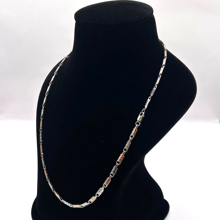 This modern chain features alternating links in silver and rose gold tones, creating a striking dual-color effect. The elongated links are detailed with a fine texture or pattern, giving the piece movement and shine. It's an elegant, versatile chain, perfect for standalone wear.