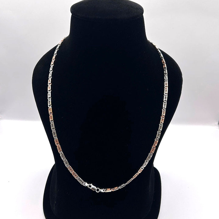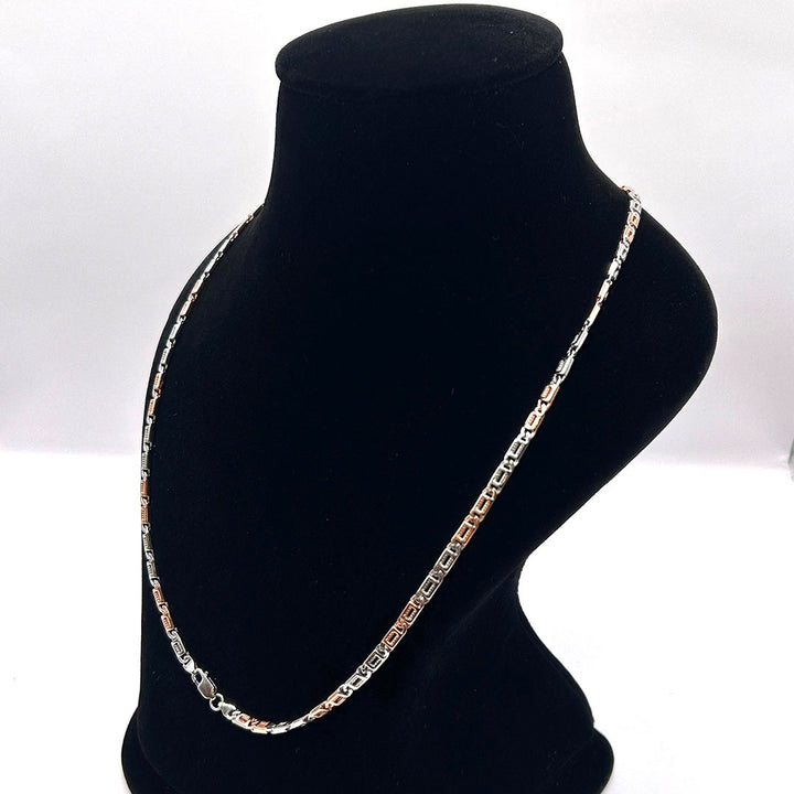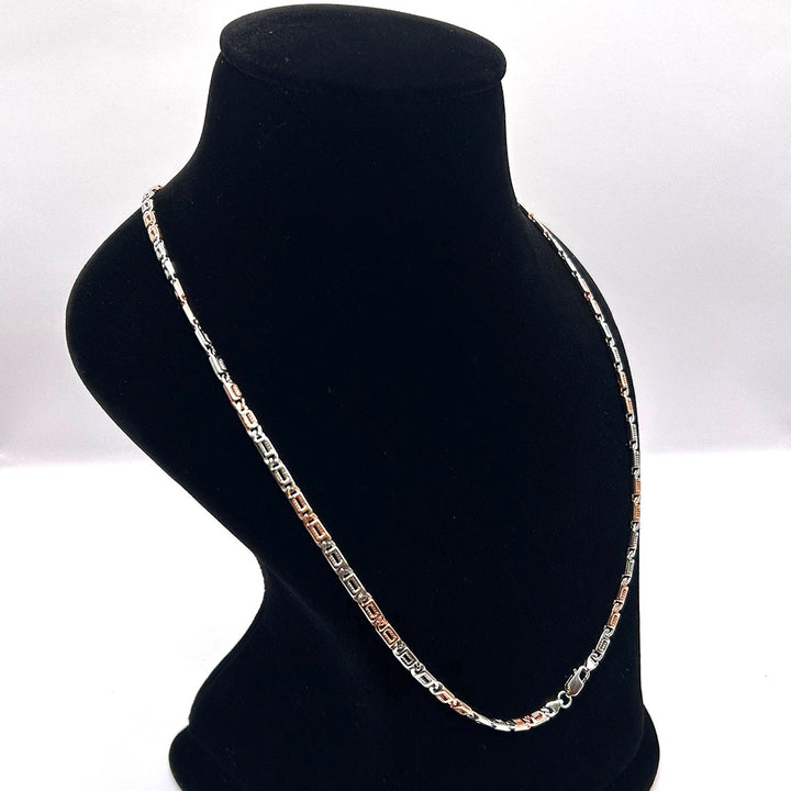 This stylish chain features a modern link design, alternating between silver and rose gold-toned rectangular bars. The flat, polished surfaces create a high shine and geometric look. It's an excellent, versatile piece for wearing alone or as a layering essential.