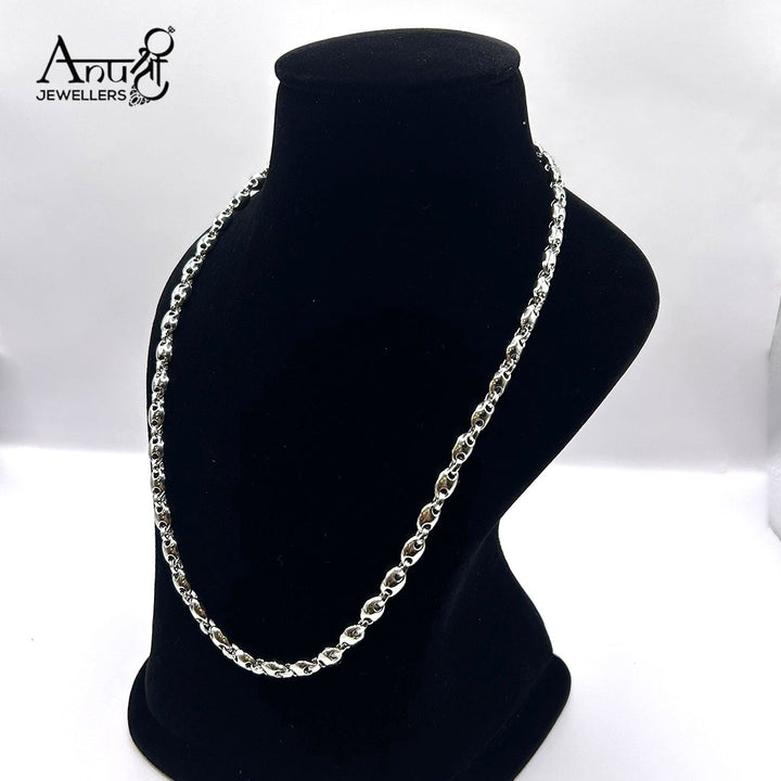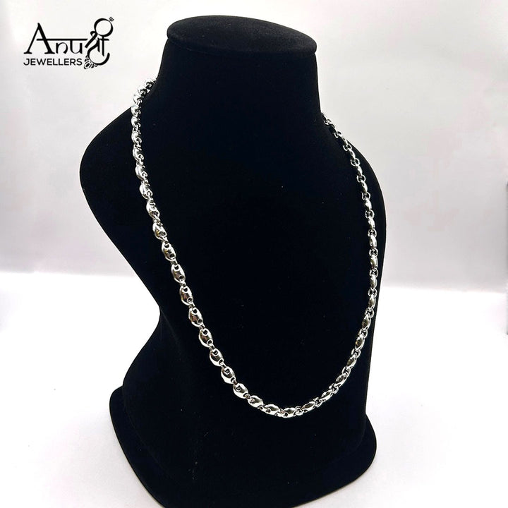 This statement silver-toned chain features a continuous strand of polished, interlocking "coffee bean" or "Mariner" links. The smooth, rounded, and elongated shape gives the chain a luxurious weight and shine. It's a bold, versatile piece for standalone wear.