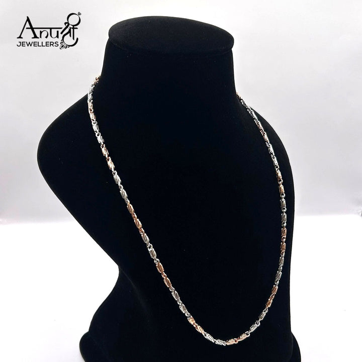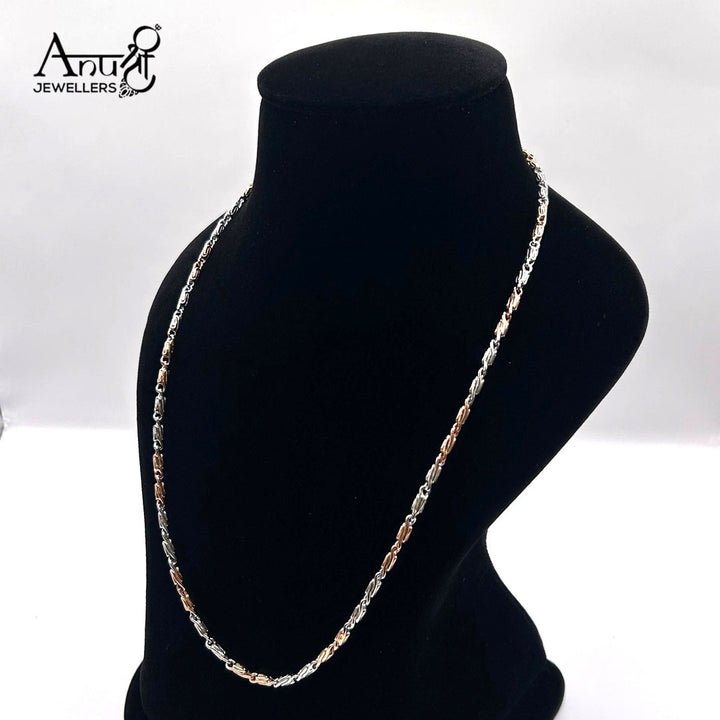 This modern chain features alternating silver and rose gold-toned elongated oval links. The subtle contrast and smooth, reflective surface create a fluid design. It's a stylish, versatile piece, perfect for layering or as a sophisticated standalone chain.