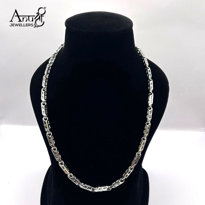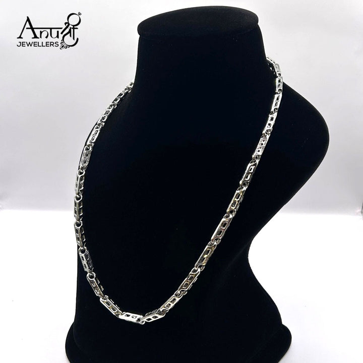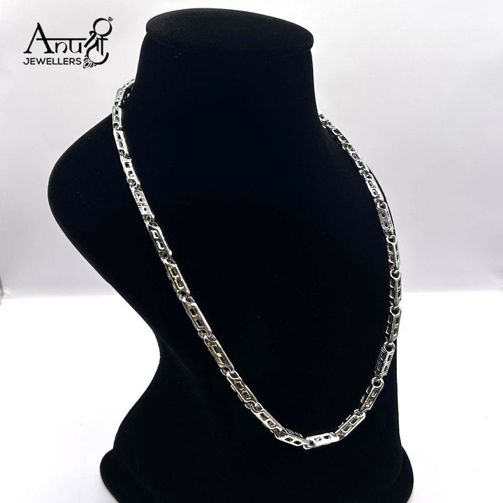 This bold and durable chain features substantial, rectangular links connected by smaller rings, creating a geometric and textured appearance. The polished finish gives it a bright shine, making it an excellent statement piece for a contemporary jewelry collection.