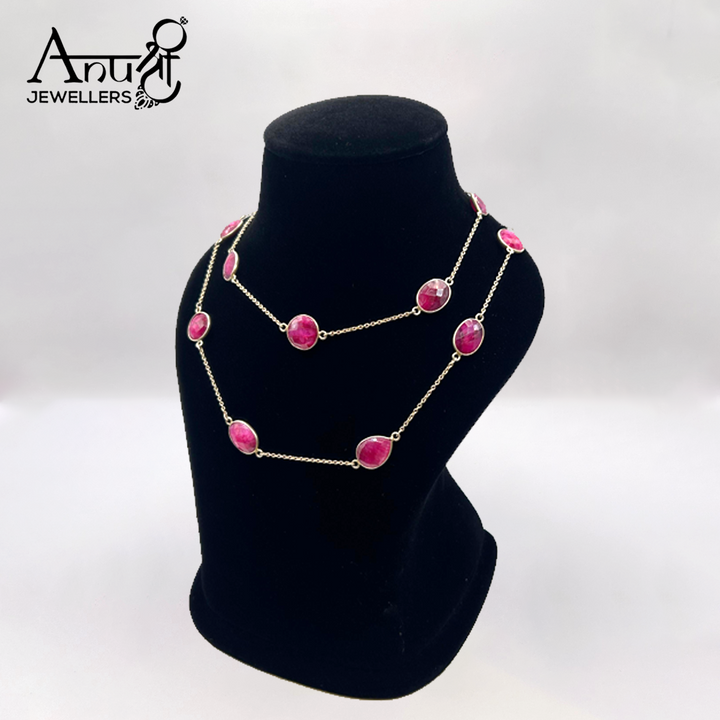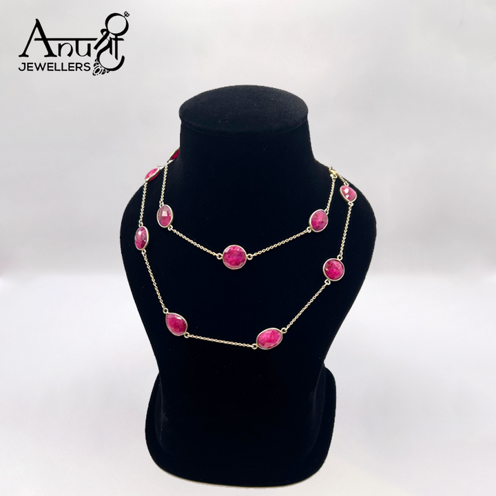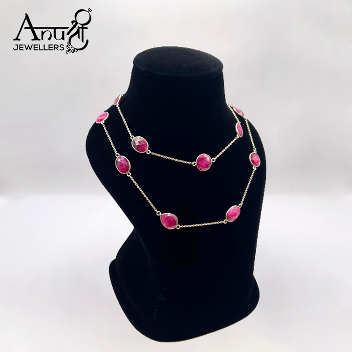 Add a pop of luxury with this ruby-toned gemstone necklace from Anushree Jewellers. Featuring vibrant oval-cut pink stones set in a delicate gold-plated chain, this statement piece exudes charm and sophistication. Perfect for festive occasions, weddings, or gifting, it’s designed to turn heads effortlessly.