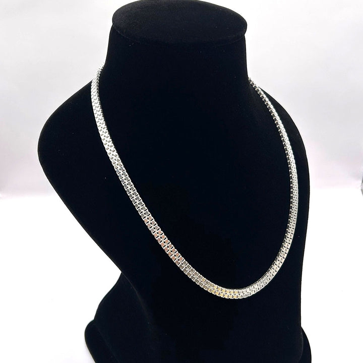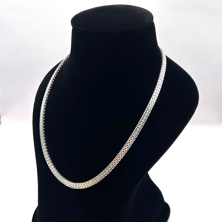 This luxurious silver-toned chain features a smooth, flexible mesh or snake link design that lies flat against the collarbone. Its dense construction provides a substantial feel and a brilliant, continuous shine, making it an excellent statement piece on its own.