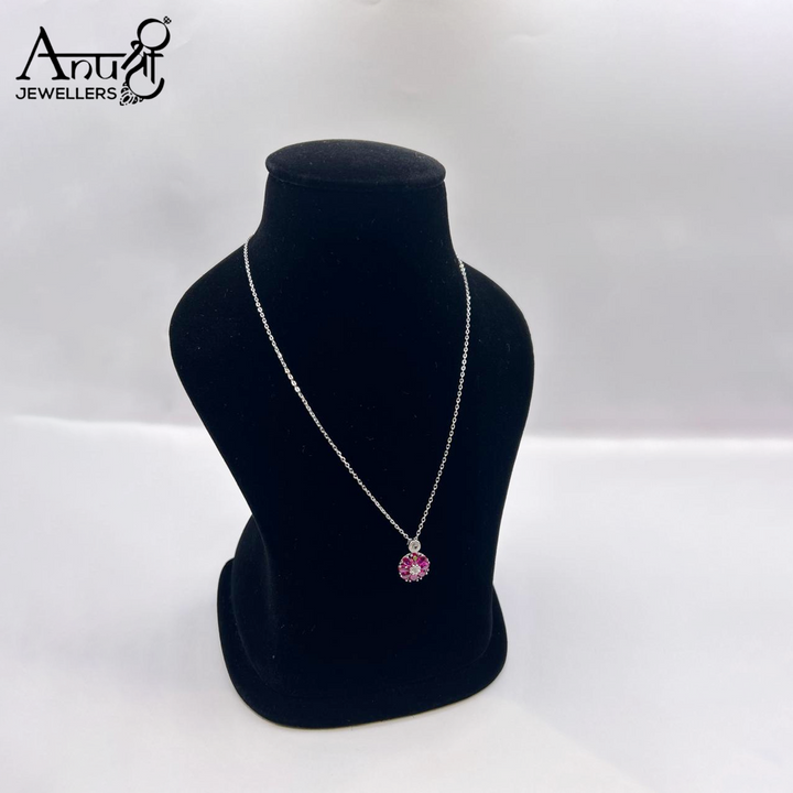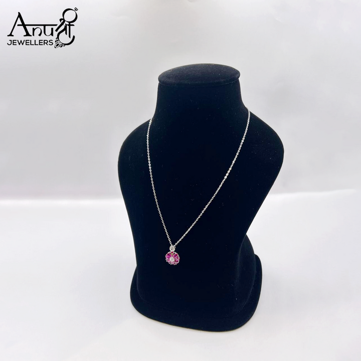 This elegant silver or white gold-toned necklace features a delicate chain and a stunning pendant. The design showcases a central vibrant pink/ruby cluster surrounded by a shimmering halo of clear stones. A small accent stone above the pendant completes this versatile, sophisticated look.