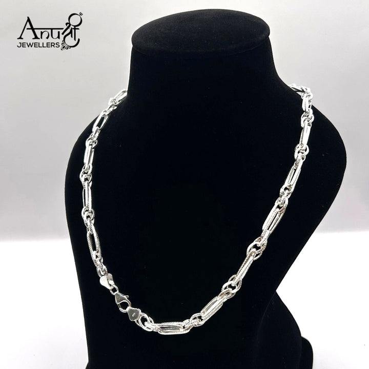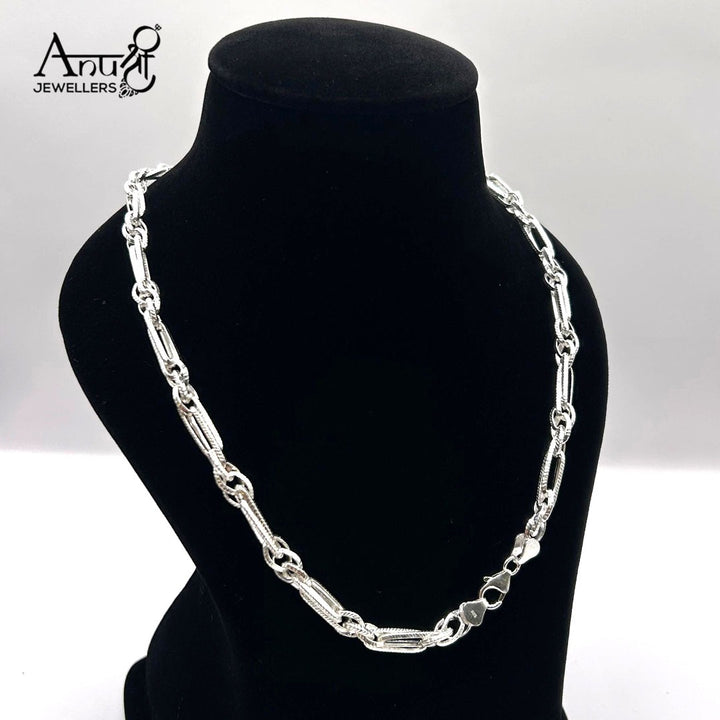 This bold silver-toned chain features a unique link design that alternates between smooth, elongated links and textured, flattened links. The interlocking pattern gives the chain a heavy, dimensional look and a high-shine finish, making it a powerful standalone statement.