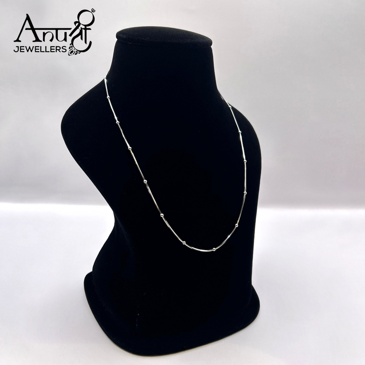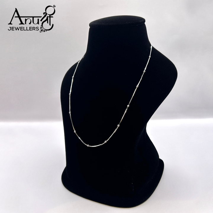 Elevate your look with this beaded silver chain necklace from Anushree Jewellers. Featuring a sleek design with delicate silver beads spaced along the chain, this piece blends simplicity with style. Perfect for both casual wear and special occasions, it’s a versatile addition to any jewelry collection.