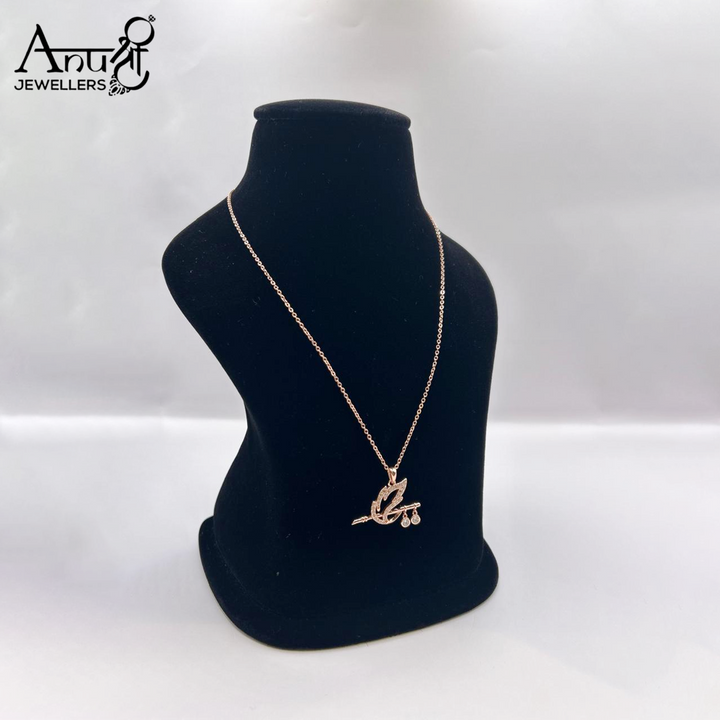 This delicate rose gold-toned necklace features a dainty chain and a unique pendant combining a peacock feather motif with a Lord Krishna's flute (Murali/Bansuri). The piece is accented with clear stones for sparkle and finished with small droplet dangles, offering a graceful, spiritual touch.
