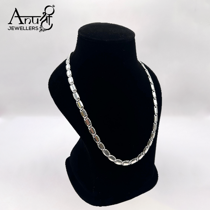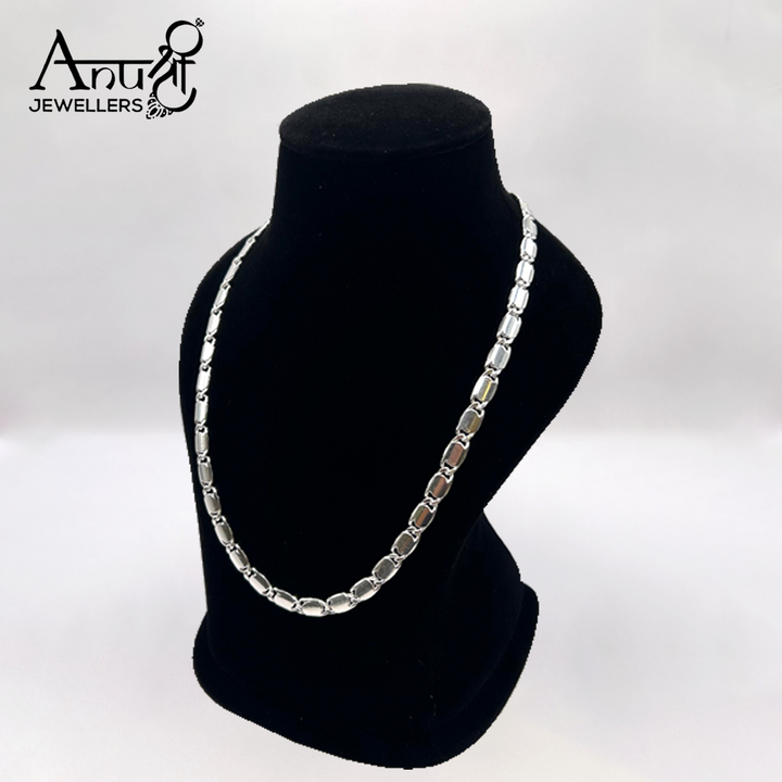 Add timeless elegance to your style with this classic silver chain from Anushree Jewellers. Designed with smooth rectangular links, it offers a modern yet minimalistic look, making it perfect for daily wear or special occasions.