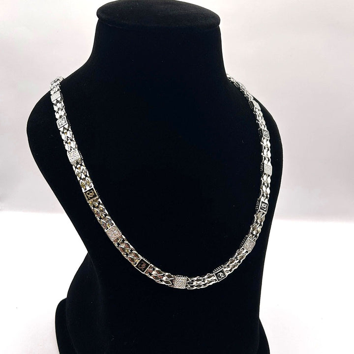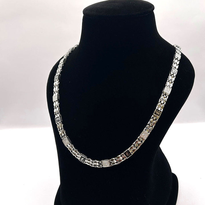 This heavy silver-toned chain features a dense, woven link interspersed with geometric square segments. These squares alternate between textured, dark inlays and pave-set clear stones, creating a rich, dimensional, and luxurious statement piece.