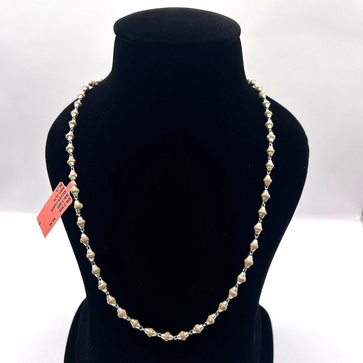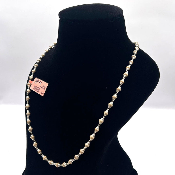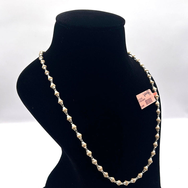 This elegant, long silver-toned chain features a continuous strand of distinctively shaped beads, possibly a tapered or spiral design, separated by smaller linking elements. Its considerable length makes it ideal for layering or wearing as a single, sophisticated statement piece with both traditional and contemporary outfits.