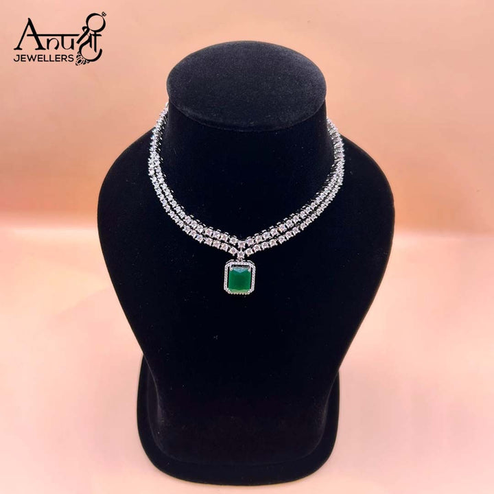 Dazzle in elegance with this diamond-studded necklace set featuring a stunning emerald green stone pendant and matching earrings. Designed by Anushree Jewellers, this jewelry set blends classic charm with modern sophistication, making it perfect for weddings, parties, and festive occasions.