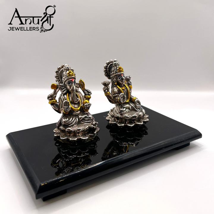 Silver-Plated Laxmi & Ganesha Idol Set on Black Base – For Pooja & Home Décor