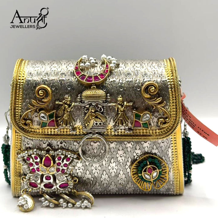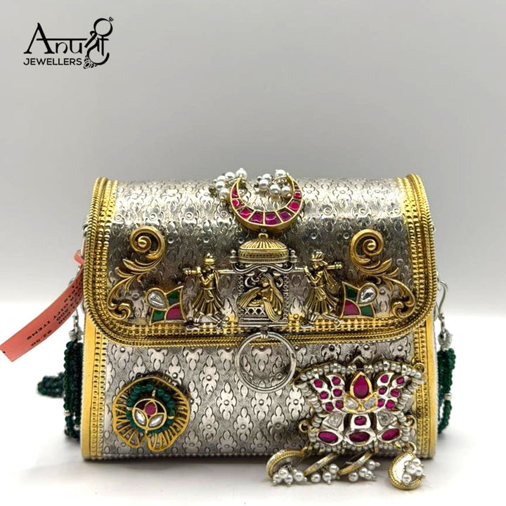 This ornate silver and gold handbag from Anushree Jewellers features intricate craftsmanship with embossed floral patterns, temple-style figurines, and gemstone embellishments in ruby and emerald hues, weighing 174.5 grams, blending luxury with traditional Indian artistry.