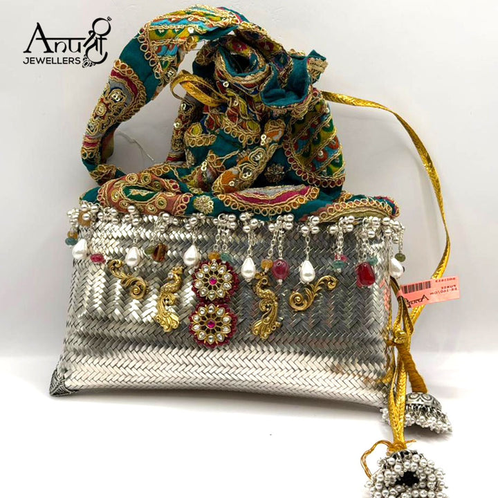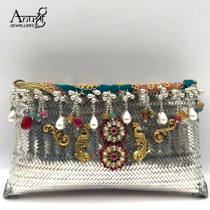 This exquisite 300.00-gram Silver handcrafted clutch from Anushree Jewellers features a silver base adorned with intricate gold-toned peacock motifs, sparkling gemstones, and lustrous pearl drops. The vibrant embroidered trim adds a touch of traditional charm, making it a perfect accessory for festive occasions and elegant evening events.