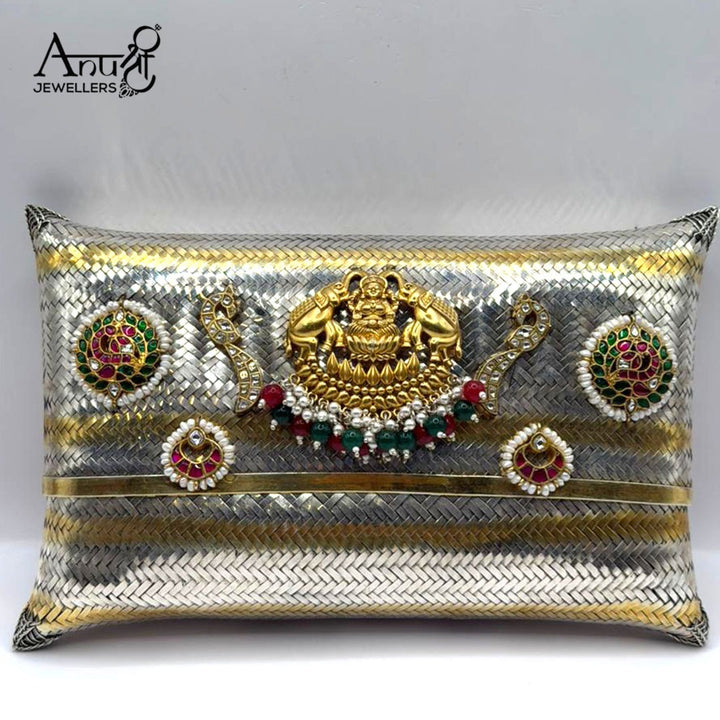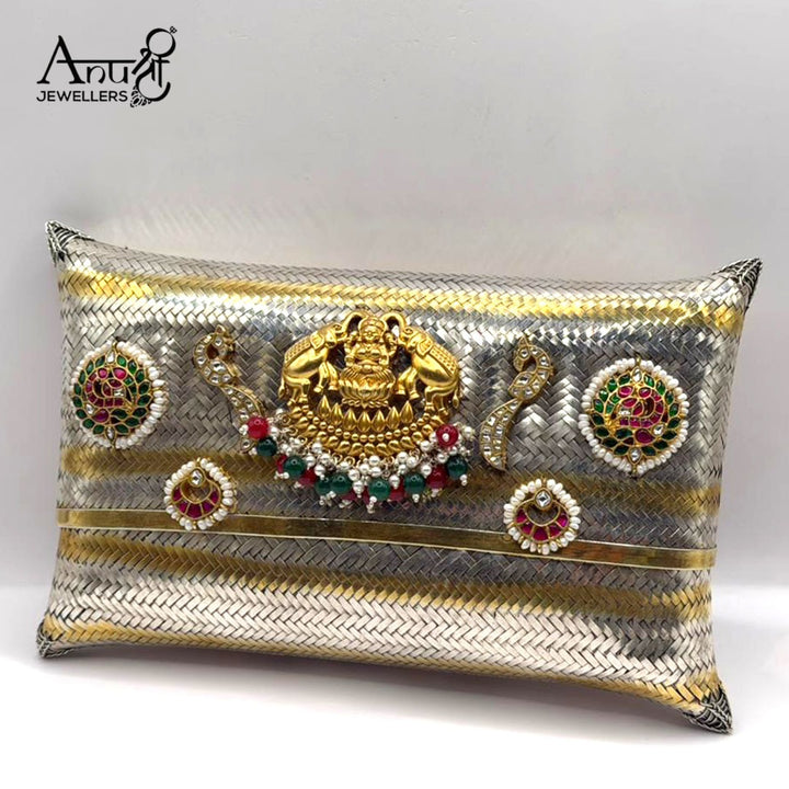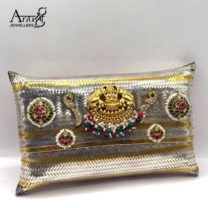 Silver Handcrafted Clutch with Temple Motif Design. Weighing 367.500 grams, this stunning clutch from Anushree Jewellers features a silver base adorned with gold temple-style motifs. Accented with ruby, emerald, and pearl embellishments, this masterpiece beautifully blends divine artistry with timeless elegance.