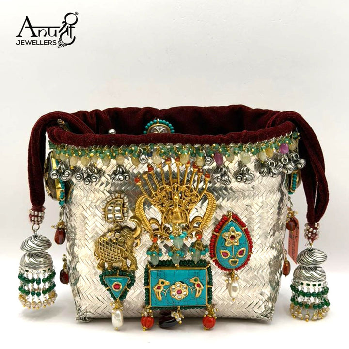 Majestic Silver Potli Bag with Maroon Velvet and Gemstone Embellishments. This 441.300-gram handcrafted potli from Anushree Jewellers exudes royal elegance with its silver base, adorned with intricate gold motifs, turquoise enamel work, and multicolored gemstone drops. The rich maroon velvet drawstring top, detailed with beads and silver charms, enhances its luxurious appeal.