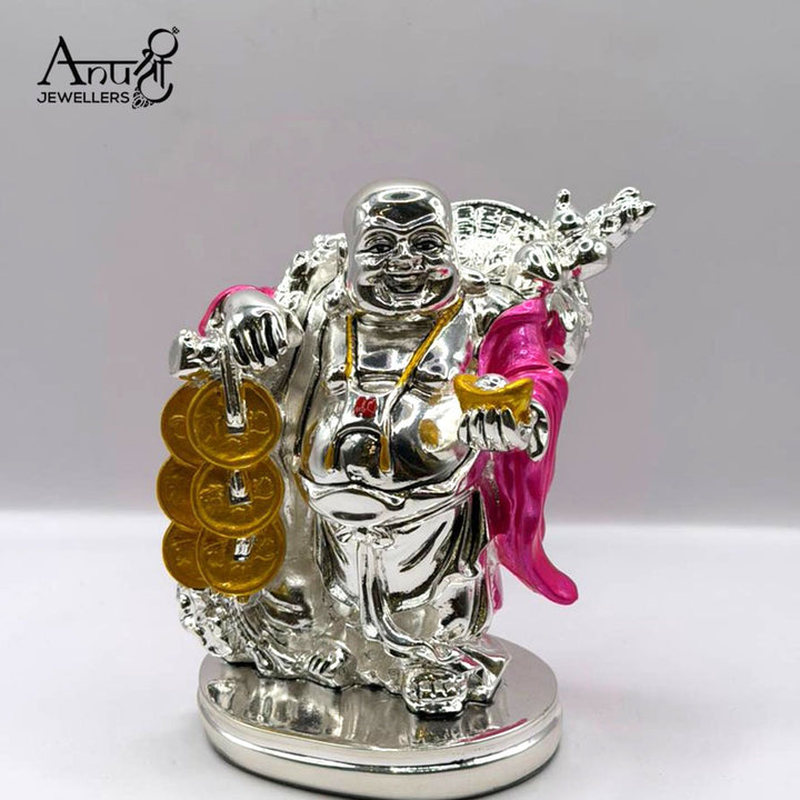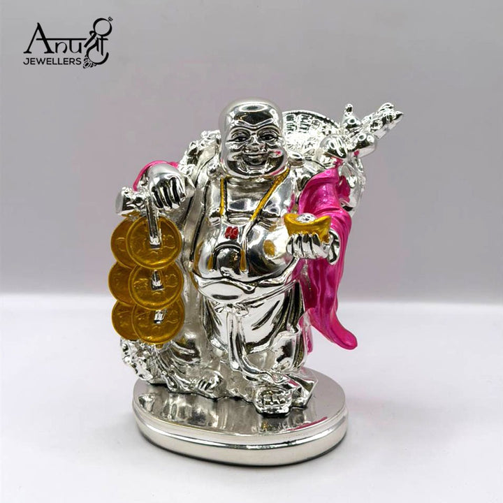 Silver Laughing Buddha Statue. A silver statue of the Laughing Buddha (Budai/Hotei), symbolizing prosperity and good fortune. He holds an ingot and a string coins, with a pink robe draped over his shoulder.