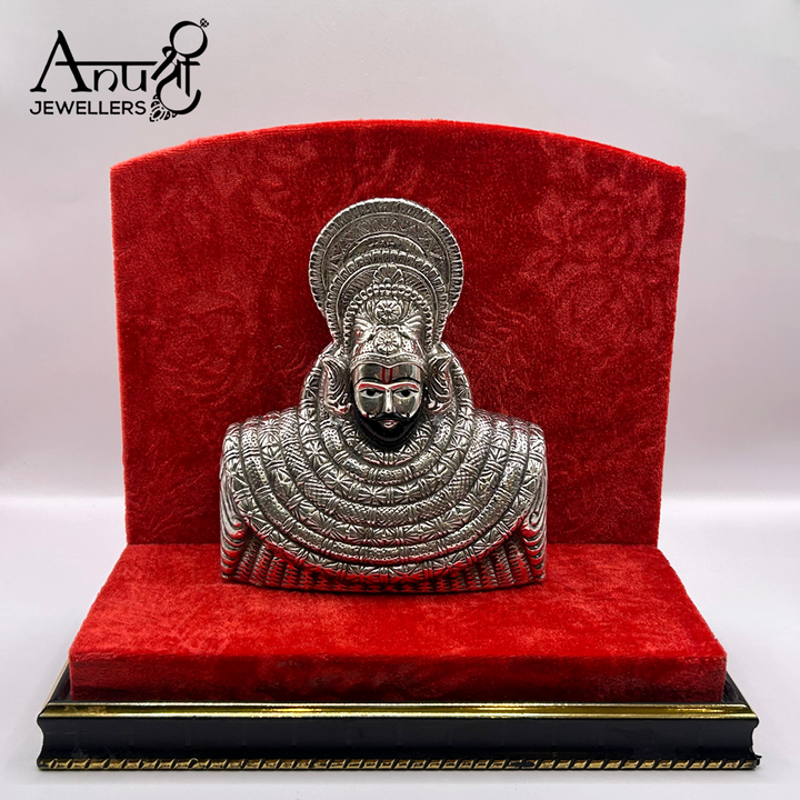 Silver-Plated Khatushyam Ji Idol with Red Velvet Backdrop – Spiritual Home & Temple Décor