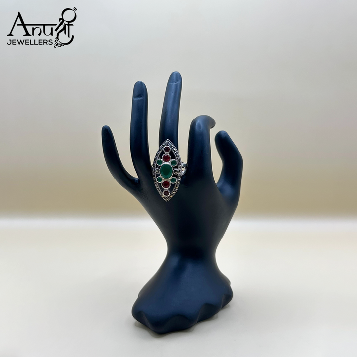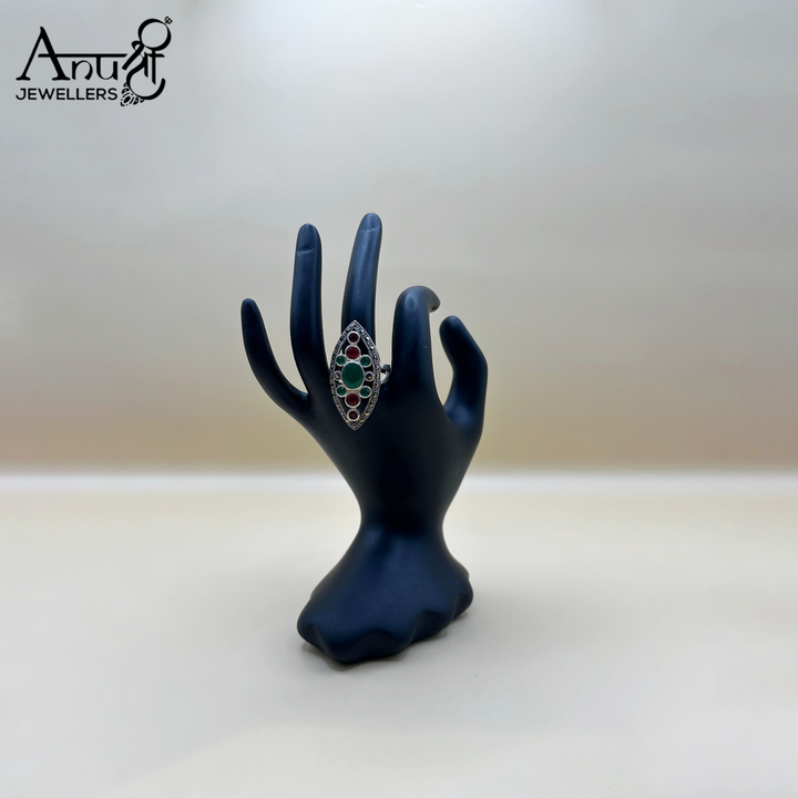 This striking statement ring features a bold marquise or boat-shaped head set in a silver-tone metal. The design showcases an elegant arrangement of multi-colored gemstones: a central oval green stone (likely an emerald or jade simulant) is surrounded by round-cut red stones (likely ruby or garnet simulants). The entire cluster is framed by a delicate border of small, brilliant white stones or metal studs, creating a luxurious, jewel-encrusted, vintage look. This piece is perfect for adding a touch of traditional luxury and color to any ensemble.