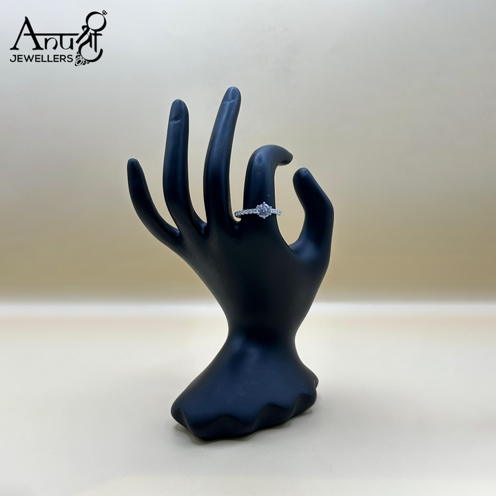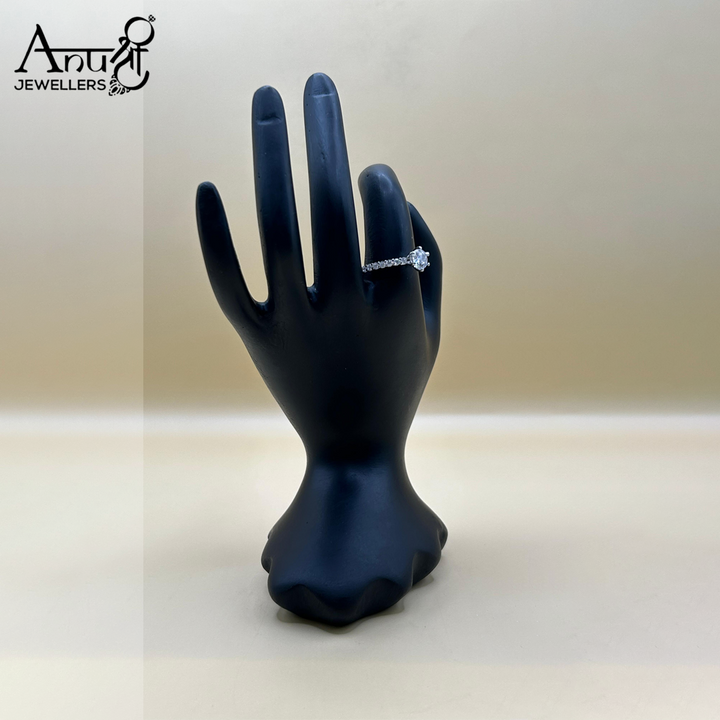 Capture the timeless elegance of this round-cut solitaire ring. The central brilliant crystal accent (or diamond-look stone) is securely held in a classic prong setting, maximizing its visibility and sparkle. The sophisticated look is completed by a half-eternity band, featuring micro-pave set crystal accents that extend down the shoulders. Set in a gleaming silver-toned finish, this ring offers a refined, high-end appearance, making it a perfect choice for an engagement, promise ring, or a dazzling addition to your daily wear.
