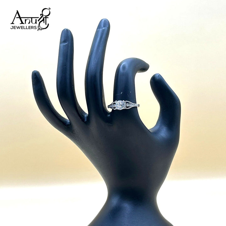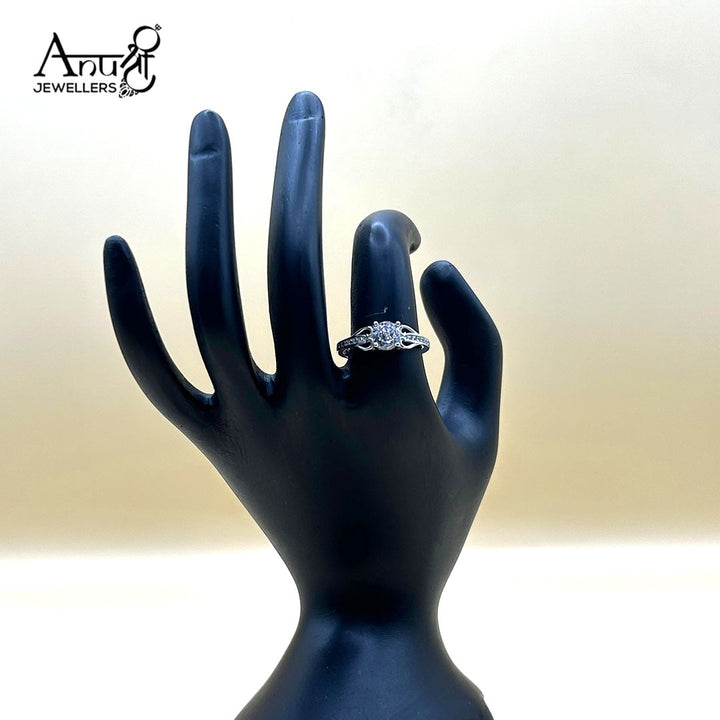 This beautiful silver-toned ring features a brilliant round center stone flanked by elegant, split-shank shoulders detailed with sparkling clear accents. The graceful, curved design offers a modern twist on the classic solitaire, perfect for an engagement or anniversary.