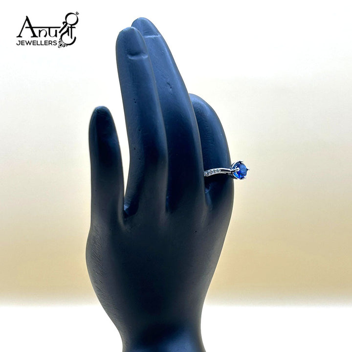 This elegant silver-toned ring features a striking round-cut blue sapphire-toned center stone set in a four-prong setting. The shoulders of the dainty band are accented with brilliant clear stones, adding a touch of sophisticated sparkle to this timeless piece.