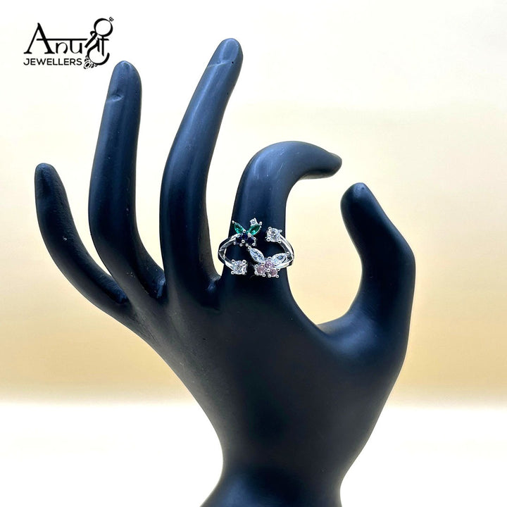 This beautiful silver-toned ring features an open-band design with a whimsical floral motif. It is set with marquise-cut clear and pink stones, highlighted by a cluster of green emerald-toned accents, creating a delicate, garden-inspired sparkle.