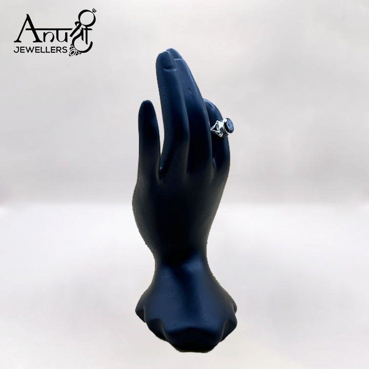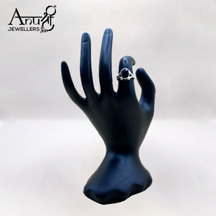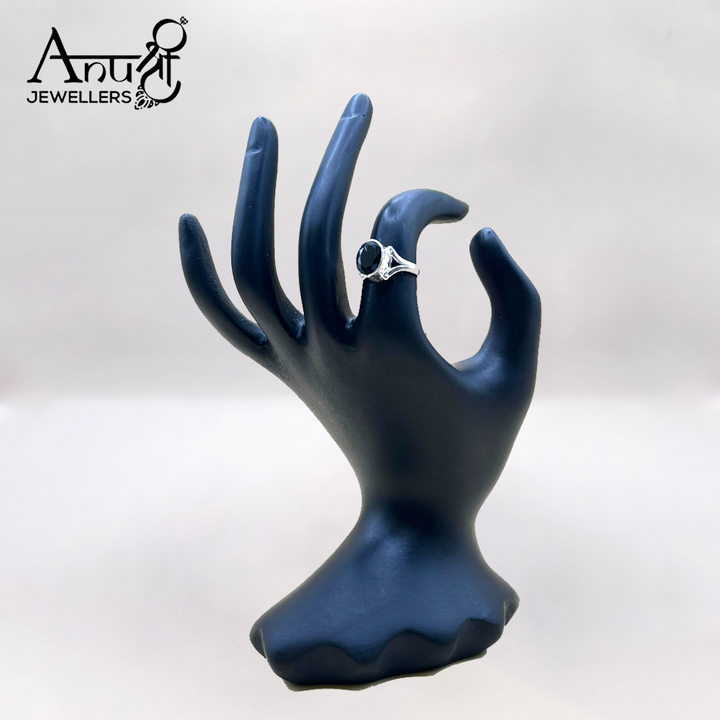 This sophisticated silver ring features a deep black gemstone set in an elegant bezel setting with decorative side details. The sleek design showcases the dark stone's rich color while the polished silver band adds contemporary appeal, creating a striking contrast in this 3.460-gram piece.