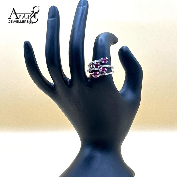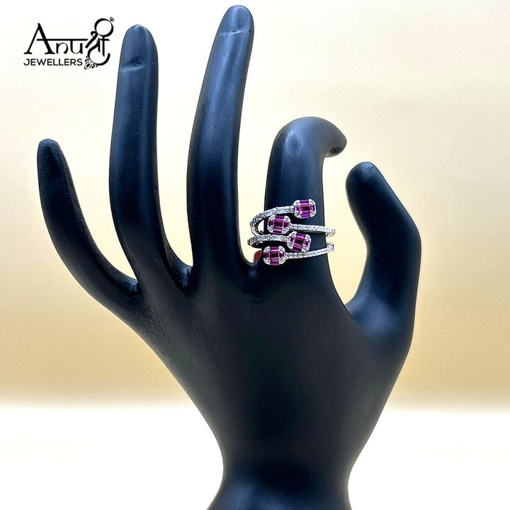Experience modern elegance with this striking bypass ring. Its sleek sterling silver bands wrap around the finger, brilliantly adorned with sparkling white stones and three vibrant magenta accents. A luxurious, contemporary statement piece.