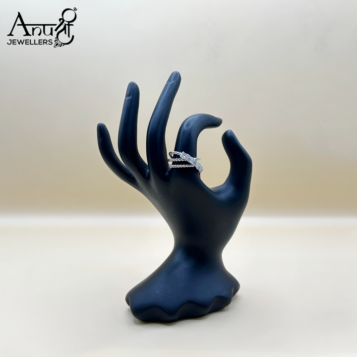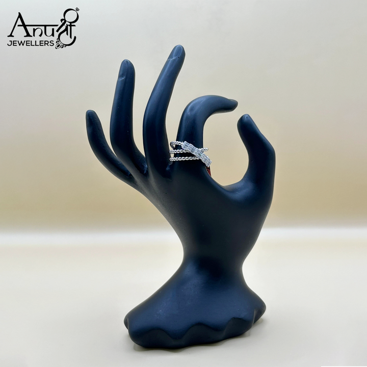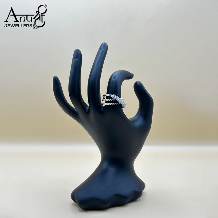 A modern and stylish piece, this ring features an artistic dual-band design in a polished silver-tone metal. One band is set with a clean, diagonal line of sparkling pave-set micro-stones, while the second band features a complementary textured or beaded metal finish. The contrasting elements create a chic, multi-layered look that is perfect for everyday wear or stacking with other contemporary jewellery.