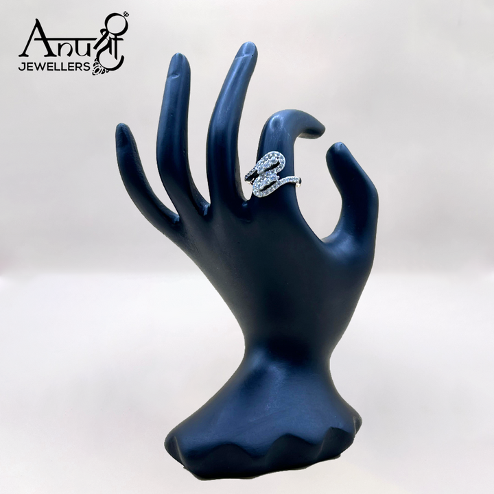 This glamorous silver ring features two sparkling clear stones in an elegant bypass design. The open-wrap style creates a modern sculptural look while securely holding both gemstones. The substantial 5.460-gram construction offers durability and presence, perfect for making a bold statement piece.