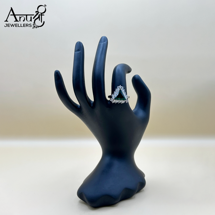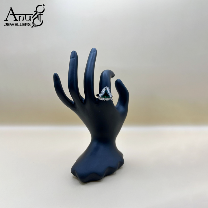 Stunning silver ring featuring a brilliant triangular centerpiece framed by sparkling accent stones. This sophisticated geometric design combines modern elegance with timeless appeal, perfect for special occasions or statement styling."
