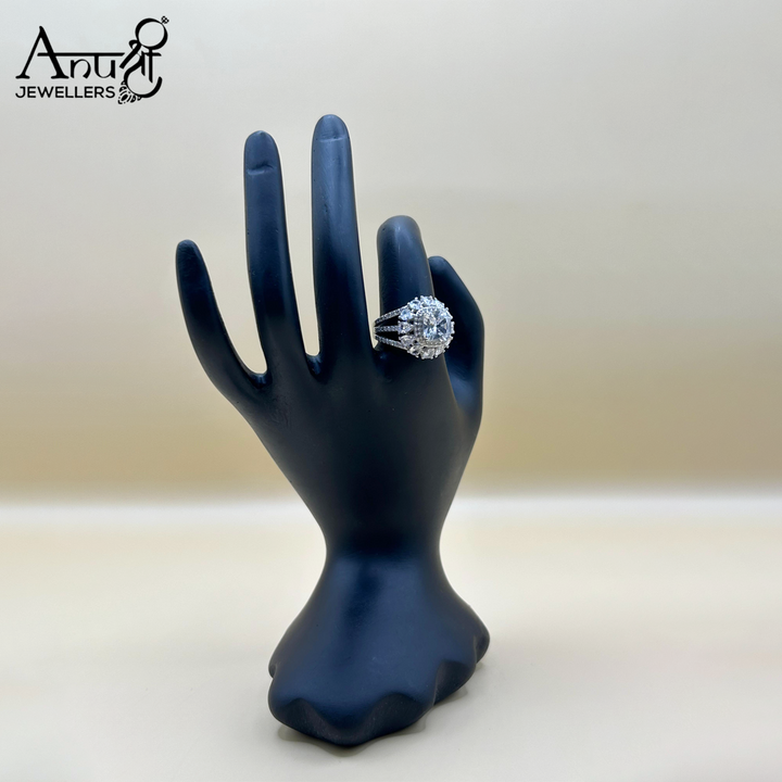 The central design is composed of a large main stone surrounded by multiple concentric halo settings of smaller pave-set stones, creating the illusion of a massive, single diamond. The generous spread and brilliant setting make this ring a dazzling statement piece. The band itself is crafted from a polished silver-tone metal, likely featuring multiple rows or split shanks to support the substantial head of the ring. It is an ideal accessory for formal occasions, engagements, or as a spectacular cocktail ring.
